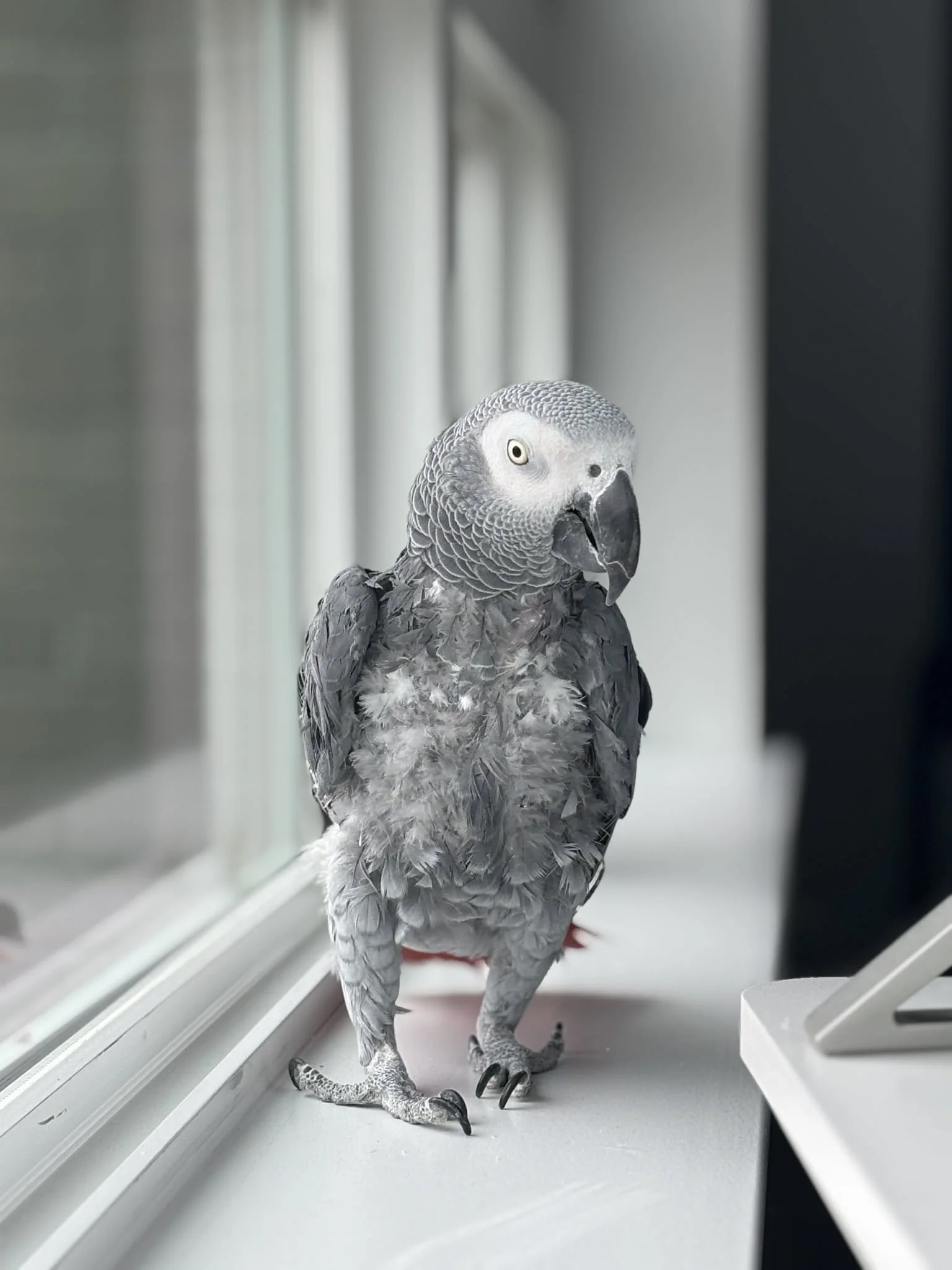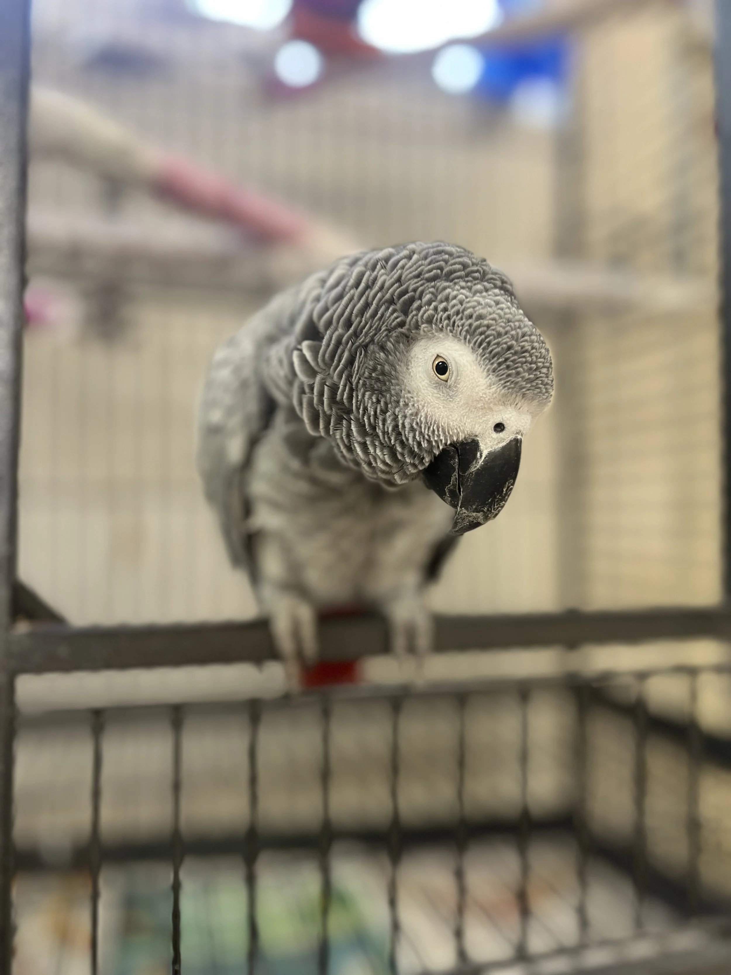 Echo is one of our newer Nesters that we have known for a long time prior to her joining us! She is a poised little lady with lots of spunk, she loves throwing her head and dancing with us and the other greys, as well as hanging/swinging upside down in her cage. She is such a little love and is the sister of one of our greys, Steiner!